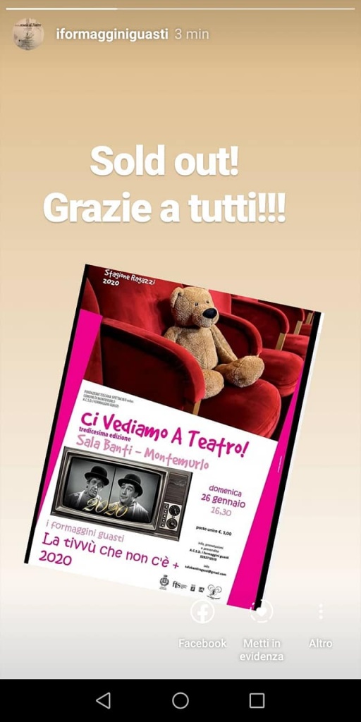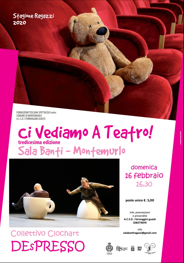 “Grandissimo successo per la 13esima edizione della rassegna “Ci vediamo a teatro!” che si è chiusa domenica 16 febbraio con lo spettacolo “DEsPRESSO”. Sala Banti sempre piena, divertimento e anche riflessione. Grazie a Fondazione Toscana Spettacolo Onlus e alla compagnia dei i formaggini guasti – movimento di cultura teatrale per aver reso possibile questo fantastico risultato. “A Montemurlo il teatro ragazzi è una bellissima opportunità di crescita e di formazione. Abbiamo chiuso una stagione con numeri da tutto esaurito e siamo davvero orgogliosi. Grazie a tutti i bambini, ai ragazzi, alle famiglie e ai nonni che hanno trascorso con noi dei pomeriggi piacevoli in compagnia della magia del teatro” ha detto l’assessore Giuseppe Forastiero”.